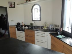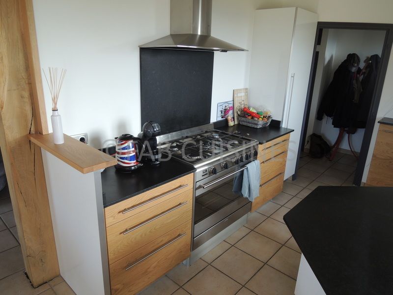 Cuisine sur mesure deux coloris associait chêne et blanc brillant ainsi qu’un plan de travail granit noir et pour la cuisson un piano et une hotte NOVY